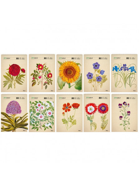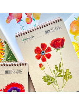 Każdy szkicownik poświęcony jest innemu kwiatowi: słonecznik, irys, mak, hiacynt, hibiskus, zawilec, jaskier, piwonia, róża czy bratek.